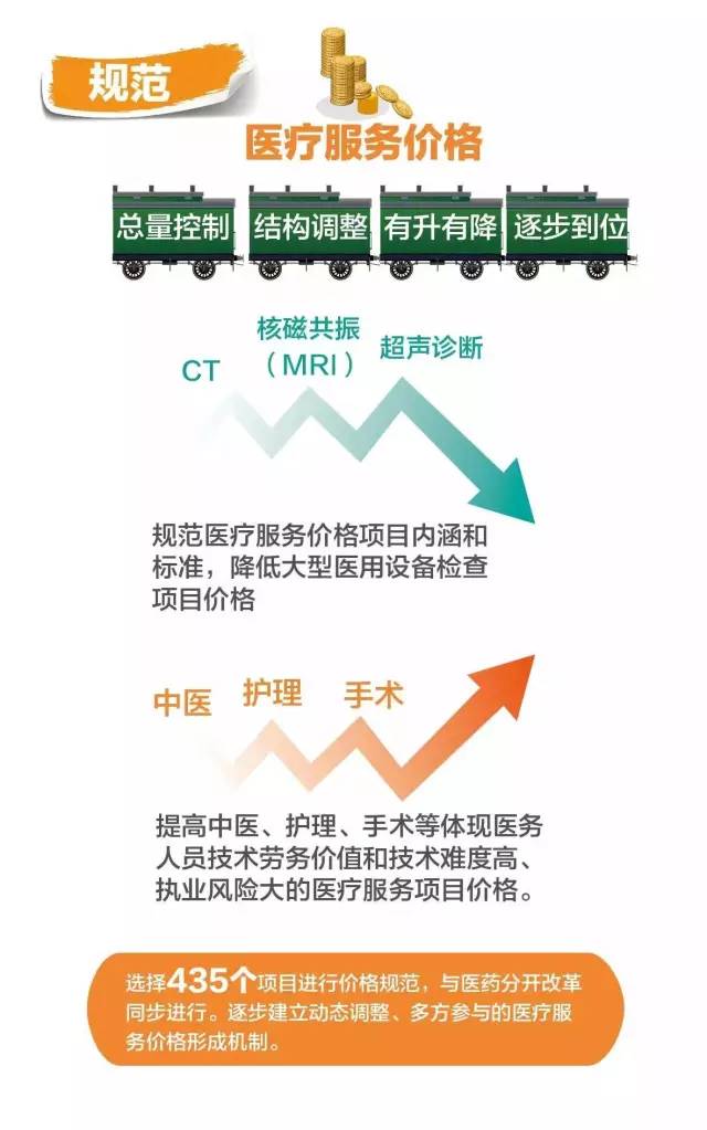 (三)規范醫療服務價格。按照“總量控制、結構調整、有升有降、逐步到位”的原則,推進醫療服務價格改革,建立完善動態調整、多方參與的醫療服務價格形成機制。降低大型醫用設備檢查項目價格,提高中醫、護理、手術等體現醫務人員技術勞務價值和技術難度高、執業風險大的醫療服務項目價格,逐步理順醫療服務比價關系。首批選擇435個項目進行價格規范。