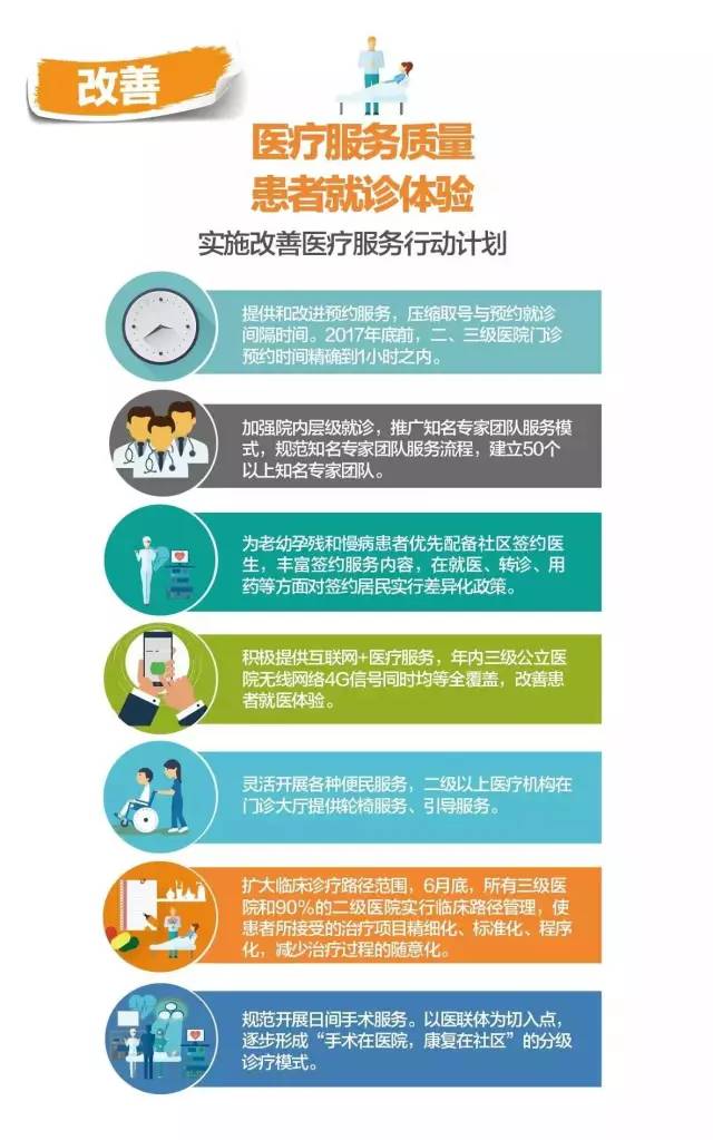 (四)改善醫療服務。實施改善醫療服務行動計劃,強化醫務人員的服務意識,提高醫療服務質量和水平。建立健全醫療質量管理長效機制,綜合考慮醫療質量安全、基本醫療需求等因素,加強臨床路徑管理,促進治療項目精細化、標準化;加強藥品處方審核和處方點評,促進合理用藥。大力推行非急診預約診療服務,推廣知名專家團隊服務模式,規范服務流程,改善患者就醫體驗。豐富家庭醫生簽約服務內容,使居民享受到更加便利的就醫、轉診服務。推動京津冀三地醫療機構檢查結果互認。