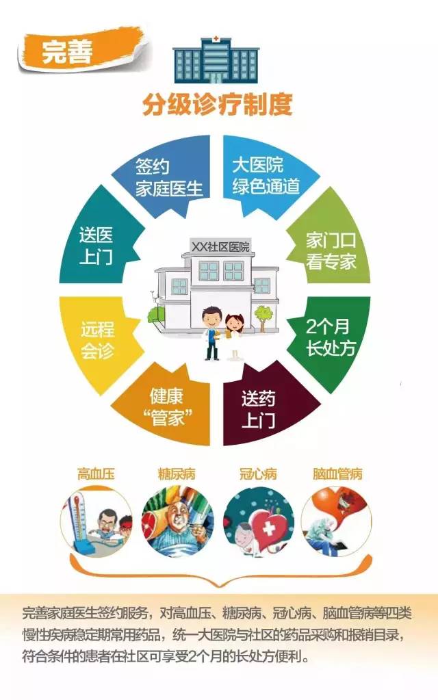 (六)完善分級診療制度。完善分級診療政策體系,健全醫療機構分工協作機制,逐步實現基層首診、雙向轉診、急慢分治、上下聯動。推進緊密型醫聯體與專科醫聯體建設,提供連續性的醫療服務。引導大醫院醫生和返聘專家到基層工作,提高基層醫療服務供給能力和水平。完善家庭醫生簽約服務,對高血壓、糖尿病、冠心病、腦血管病等4類慢性疾病穩定期常用藥品,統一大醫院與基層醫療衛生機構的采購和報銷目錄,符合條件的患者在基層醫療衛生機構可享受2個月的長處方便利,有序分流三級醫院門診量。