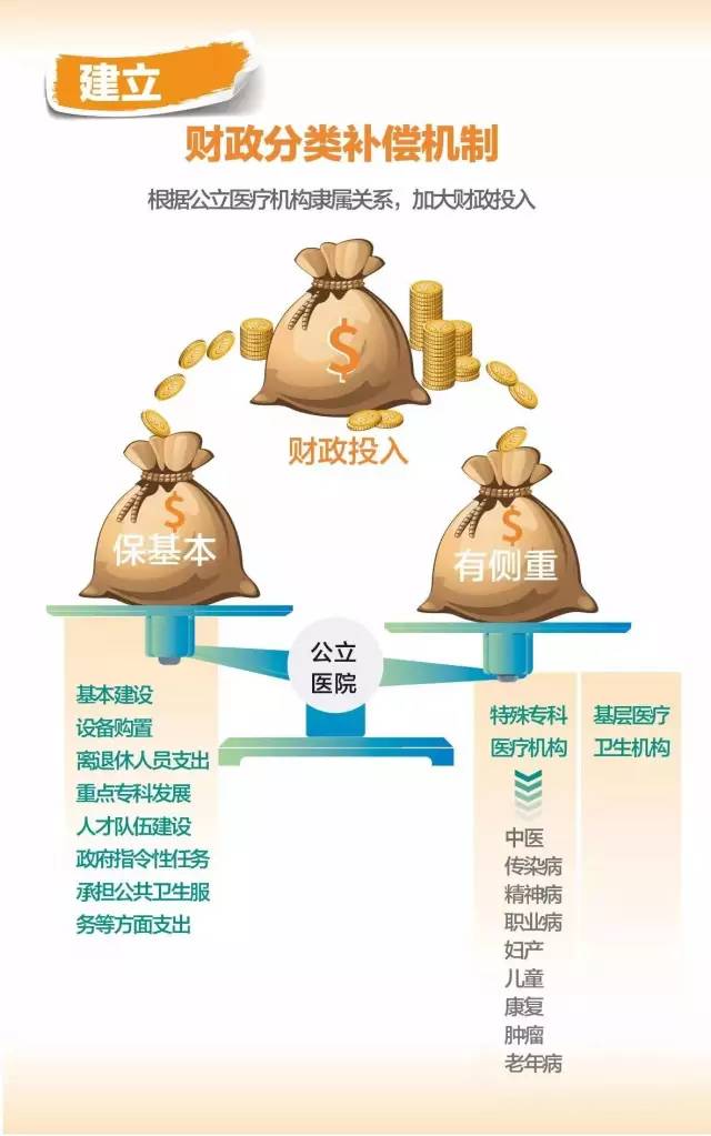 (七)建立財政分類補償機制。根據公立醫療機構隸屬關系落實財政投入政策,對積極參加醫藥分開綜合改革且效果良好的醫療機構給予適當補助,保障公立醫療機構基本建設和設備購置、離退休人員費用、重點專科發展、人才隊伍建設、政府指令性任務及承擔公共衛生服務等方面支出。不斷完善財政分類投入政策,對中醫(含中西醫結合、民族醫)、傳染病、精神病、職業病、婦產、兒童、康復、腫瘤、老年病等醫療機構及基層醫療衛生機構群zslm619予以傾斜,促進各級各類醫療機構協調發展。
