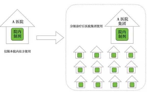 1、 分級(jí)診療的推行,醫(yī)院開始集團(tuán)化,在上級(jí)醫(yī)院治療、在下級(jí)醫(yī)院康復(fù),那么院內(nèi)制劑不限于一家醫(yī)院來處方,在整個(gè)醫(yī)院集團(tuán)內(nèi)使用。很可能在網(wǎng)絡(luò)內(nèi)的社區(qū)醫(yī)院都可以使用原先在大醫(yī)院才能處方的優(yōu)質(zhì)的院內(nèi)制劑藥品。
