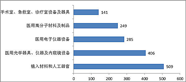 與2015年相比,植入材料和人工器官類產(chǎn)品從第二位升至第一位,而手術(shù)室、急救室、診療室設(shè)備及器具取代了介入器材進(jìn)入前五。