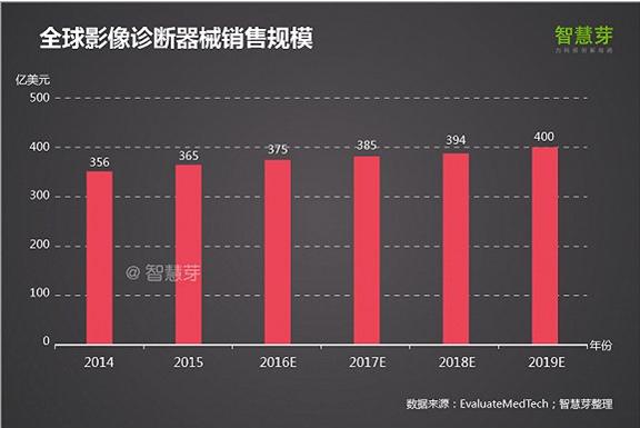全球醫(yī)療器械市場(chǎng)中,影像診斷設(shè)備約占10%的份額。隨著人們?cè)絹?lái)越重視對(duì)慢性疾病的預(yù)防,影像診斷設(shè)備市場(chǎng)規(guī)模也在不斷擴(kuò)大。2016年全球影像診斷設(shè)備銷售額達(dá)365億美元,預(yù)計(jì)2019年市場(chǎng)銷售將達(dá)到400億元。