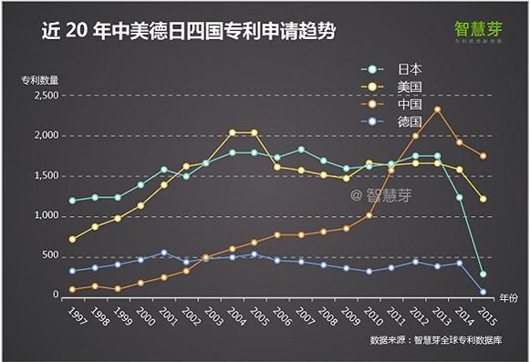 3.近20年中美日德四國(guó)的專利申請(qǐng)趨勢(shì)(圖表最好改大一點(diǎn),并把幾個(gè)國(guó)家代碼改為國(guó)家名稱。如:jp-日本,us-美國(guó),cn-中國(guó),de-德國(guó))