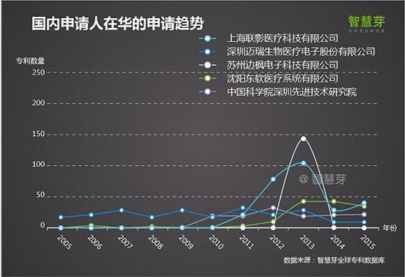 經(jīng)過(guò)多年的發(fā)展,我國(guó)在中低端醫(yī)療器械產(chǎn)品方面,產(chǎn)量居世界第一。但是,在高端醫(yī)療設(shè)備,如技術(shù)密集的醫(yī)學(xué)影像設(shè)備上,技術(shù)儲(chǔ)備和市場(chǎng)份額上距幾家巨頭仍有較大差距。從專利數(shù)量上看,我國(guó)企業(yè)從2000年開(kāi)始自主創(chuàng)新,并用專利對(duì)創(chuàng)新成果進(jìn)行保護(hù)。在醫(yī)學(xué)影像設(shè)備上,國(guó)內(nèi)企業(yè)和研究所的專利擁有量排名靠前的五家為:上海聯(lián)影醫(yī)療科技,深圳邁瑞生物醫(yī)療,蘇州邊楓電子科技,沈陽(yáng)東軟醫(yī)療,中科院深圳先進(jìn)技術(shù)研究院。
