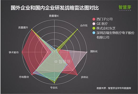 本次分析中我們以深圳邁瑞公司為例,對(duì)比國(guó)內(nèi)企業(yè)與國(guó)外“三巨頭”德國(guó)西門(mén)子,美國(guó)通用和日本東芝公司在高端影像醫(yī)學(xué)設(shè)備領(lǐng)域的專利的多項(xiàng)指標(biāo)進(jìn)行對(duì)比,從而挖掘出國(guó)內(nèi)企業(yè)和國(guó)外巨頭相比,在研發(fā)策略上的異同。