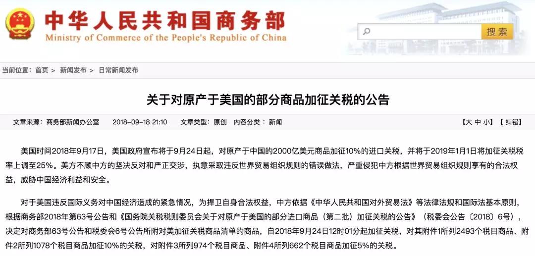 與此同時,商務(wù)部新聞發(fā)言人發(fā)表談話表示,為了維護(hù)自身正當(dāng)權(quán)益和全球自由貿(mào)易秩序,中方將不得不同步進(jìn)行反制。商務(wù)部公告稱,決定對商務(wù)部63號公告和稅委會6號公告所附對美加征關(guān)稅商品清單(中對美加征關(guān)稅第二批600億美元)的商品,自2018年9月24日12時01分起加征關(guān)稅。