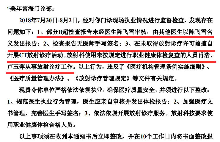 8月5日晚,美年健康發(fā)布公告,廣州美年富海門診部收到廣州市天河區(qū)衛(wèi)生和計(jì)劃生育局《責(zé)令整改通知書》,證實(shí)了美年健康美年富海門診部存在冒名醫(yī)生、體檢報(bào)告無醫(yī)師手寫簽名、違規(guī)開展CT放射診療活動(dòng)等三大違規(guī)行為: