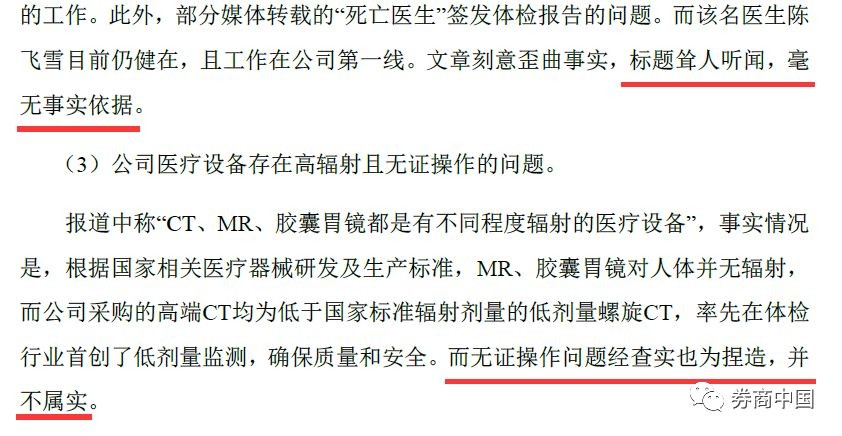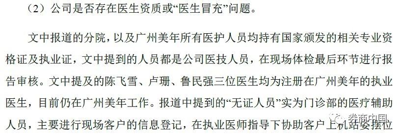 美年健康回復(fù)深交所稱,公司不存在無證上崗、持錯(cuò)證上崗或持過期證照上崗的情形。緊隨其后,澎湃新聞報(bào)道稱,廣州市天河區(qū)衛(wèi)計(jì)局表示,在對(duì)舉報(bào)涉及的三位醫(yī)生陳某、盧某、魯某進(jìn)行詢問和現(xiàn)場(chǎng)調(diào)取體檢報(bào)告后,醫(yī)生陳某表示部分患者報(bào)告非其本人審核,美年富海門診部涉嫌違規(guī)出具報(bào)告。