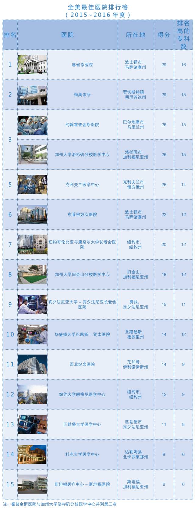 在2015~2016年度的全美最佳醫院排行榜中,137家醫院——不足全美醫療機構總數的3%——成功在至少一個專科領域進入最佳排名榜單。而至少在6個專科領域進入全美前20名的醫院,才能在綜合榜單上占有一席之地。今年,共15家醫院成功登榜。