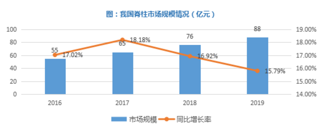 脊柱被稱之為人體的“第二生命線”,是人體的“支柱與棟梁”。隨著老齡化的加劇,脊柱領域的發病率越來越高,比如頸椎病、骨質疏松、腰椎間盤突出等等,并呈現出年輕化趨勢。據Eshare醫械匯測算,2019年脊柱市場銷售規模約為88億元,較2018年增長15.79%,脊柱市場保持高速增長。