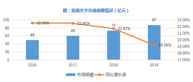 據Eshare醫械匯測算,2019年關節市場銷售規模約為87億元,較2018年增長19.18%。另外,據了解,我國關節手術患者滿意率不高,并且非常依賴醫生的經驗和手術技巧,而穩定性、精準度都較高的骨科機器人則是可以解決這一問題。