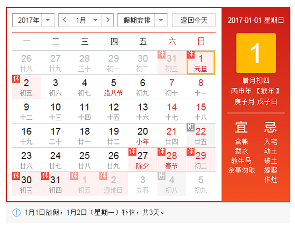 2017年北京華康普美科技有限公司,“元旦節”假期為:12月31日(星期六)至1月2日(星期一)共放假3天,1月3日(星期二)正常上班。