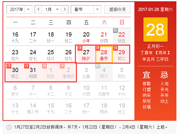 根據國家規定,北京華康普美科技有限公司2017年春節放假安排如下:2017年1月27日至2017年2月2日放假調休,共7天。春節前1月22日(星期日)正常上班,春節后2月4日(星期六)正常上班。