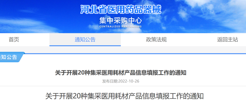 10月26日,河北省醫(yī)用藥品器械集中采購(gòu)中心發(fā)布《關(guān)于開(kāi)展20種集采醫(yī)用耗材產(chǎn)品信息填報(bào)工作的通知》,擬于近期組織開(kāi)展人工骨填充材料等20種醫(yī)用耗材集中帶量采購(gòu),現(xiàn)組織開(kāi)展相關(guān)產(chǎn)品信息填報(bào)工作。