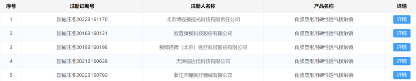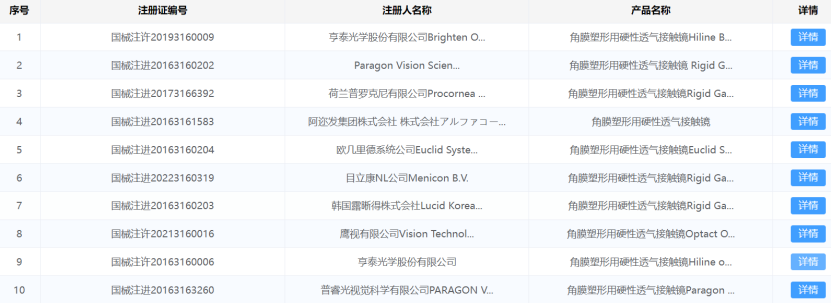 賽柏藍(lán)器械從國(guó)家藥監(jiān)局官網(wǎng)查詢了解到,據(jù)不完全統(tǒng)計(jì),目前國(guó)內(nèi)共有15款角膜塑形鏡獲批,其中10款為進(jìn)口。歐普康視、愛(ài)博醫(yī)療、天津視達(dá)佳、北京博視頓、浙江天瞳等5家企業(yè)擁有國(guó)產(chǎn)角膜塑形鏡注冊(cè)證,歐普康視、愛(ài)博醫(yī)療獲批較早,其余3家均為近兩年獲批。