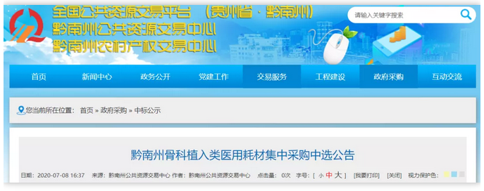 7月8日,貴州省黔南州公共資源交易中心發布《黔南州骨科植入類醫用耗材集中采購中選公告》,公布中選企業名單及價格降幅。