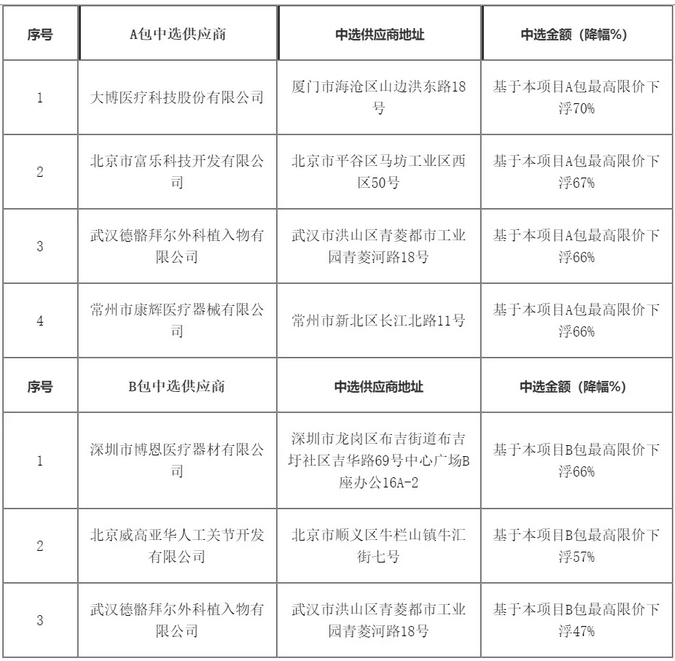 通過公開遴選、競標、議價等環節,最終4家企業入圍骨科植入(脊柱)類耗材供應商,3家企業入圍骨科植入(關節)類耗材供應商,脊柱類耗材最高降幅70%,關節類耗材最高降幅66%。