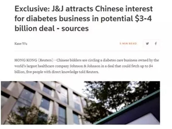 1月17日,路透社獨(dú)家重磅:中國(guó)買(mǎi)家正競(jìng)購(gòu)全球最大醫(yī)療保健公司強(qiáng)生(J & J)的糖尿病護(hù)理業(yè)務(wù),交易價(jià)格或達(dá)40億美元(約合人民幣257億元)。買(mǎi)家包括中國(guó)的上市公司三諾生物和中國(guó)建投組成的一個(gè)聯(lián)合財(cái)團(tuán)。