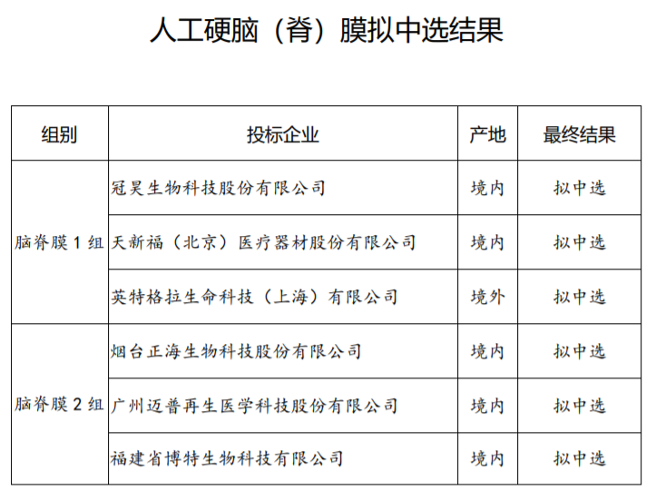 人工硬腦(脊)膜擬中選結果涉及冠昊生物、天新福、英特格拉生命科技等6家械企,在此之前,共10家械企符合申報條件;