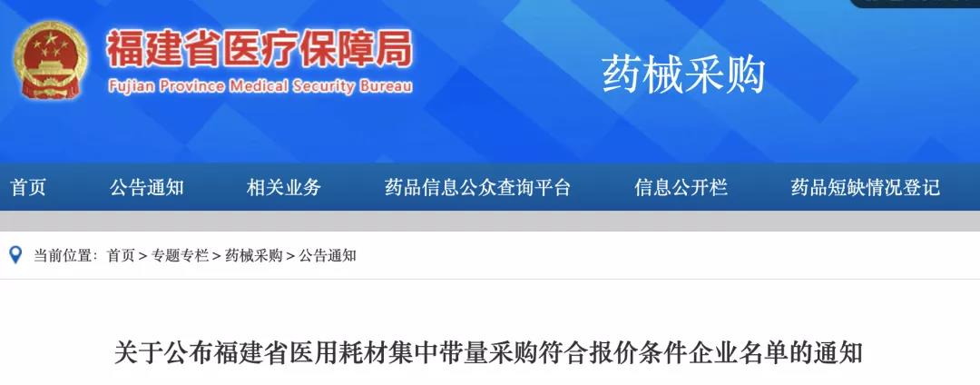 日前,福建省醫(yī)保局發(fā)布通知:根據(jù)該省醫(yī)用耗材集中帶量采購工作安排,經(jīng)省醫(yī)保局同意,現(xiàn)將符合報價條件企業(yè)名單予以公布,請相關(guān)企業(yè)做好申報報價準備工作。