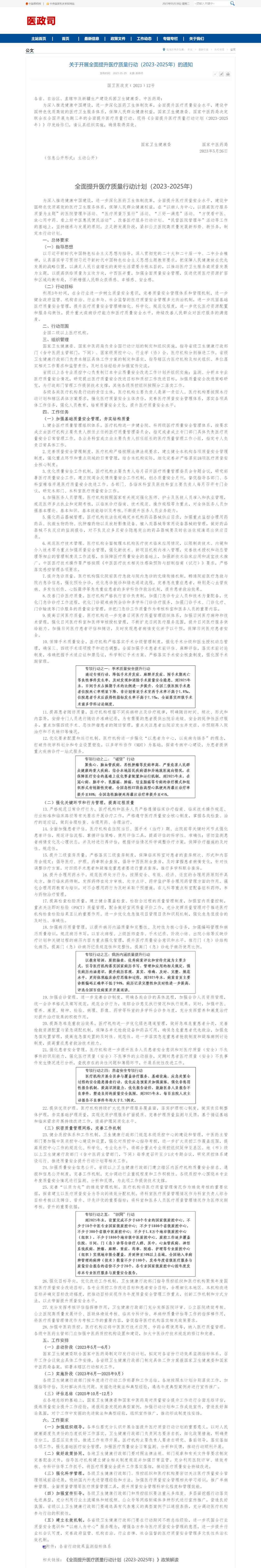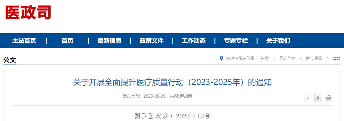 5月29日,國家衛健委發布《關于開展全面提升醫療質量行動(2023-2025年)的通知》(簡稱《通知》),從基礎質量安全管理、關鍵環節和行為管理、質量安全管理體系建設等維度提出了28項具體措施和5個專項行動。