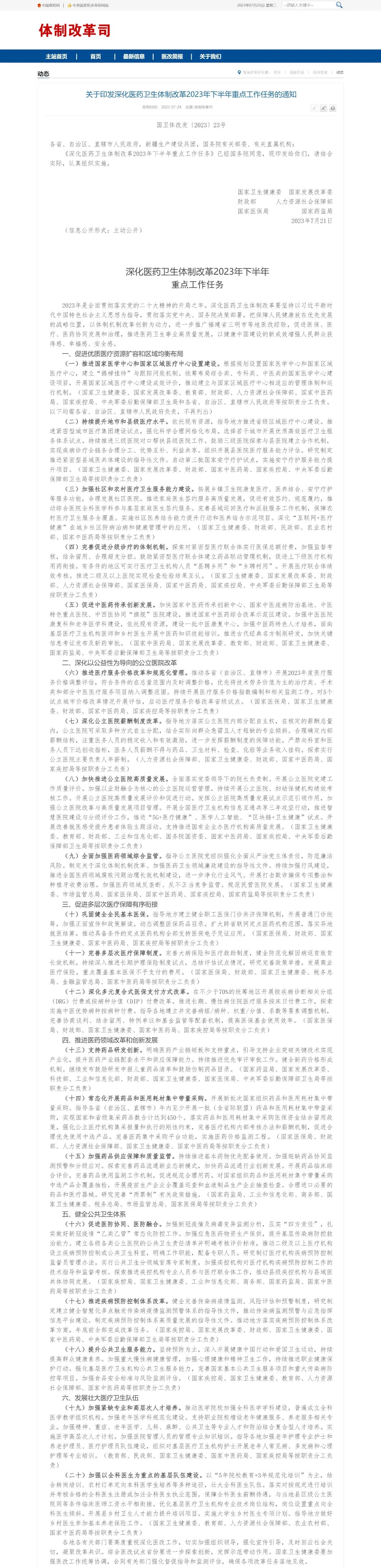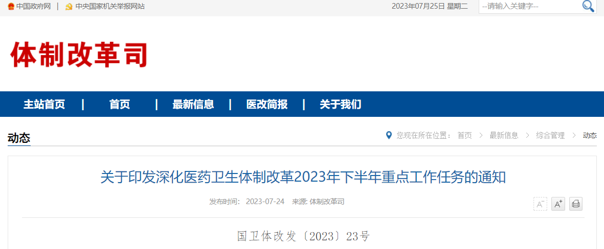 7月24日,國家衛健委官網發布《關于印發深化醫藥衛生體制改革2023年下半年重點工作任務的通知》(簡稱《通知》)。
