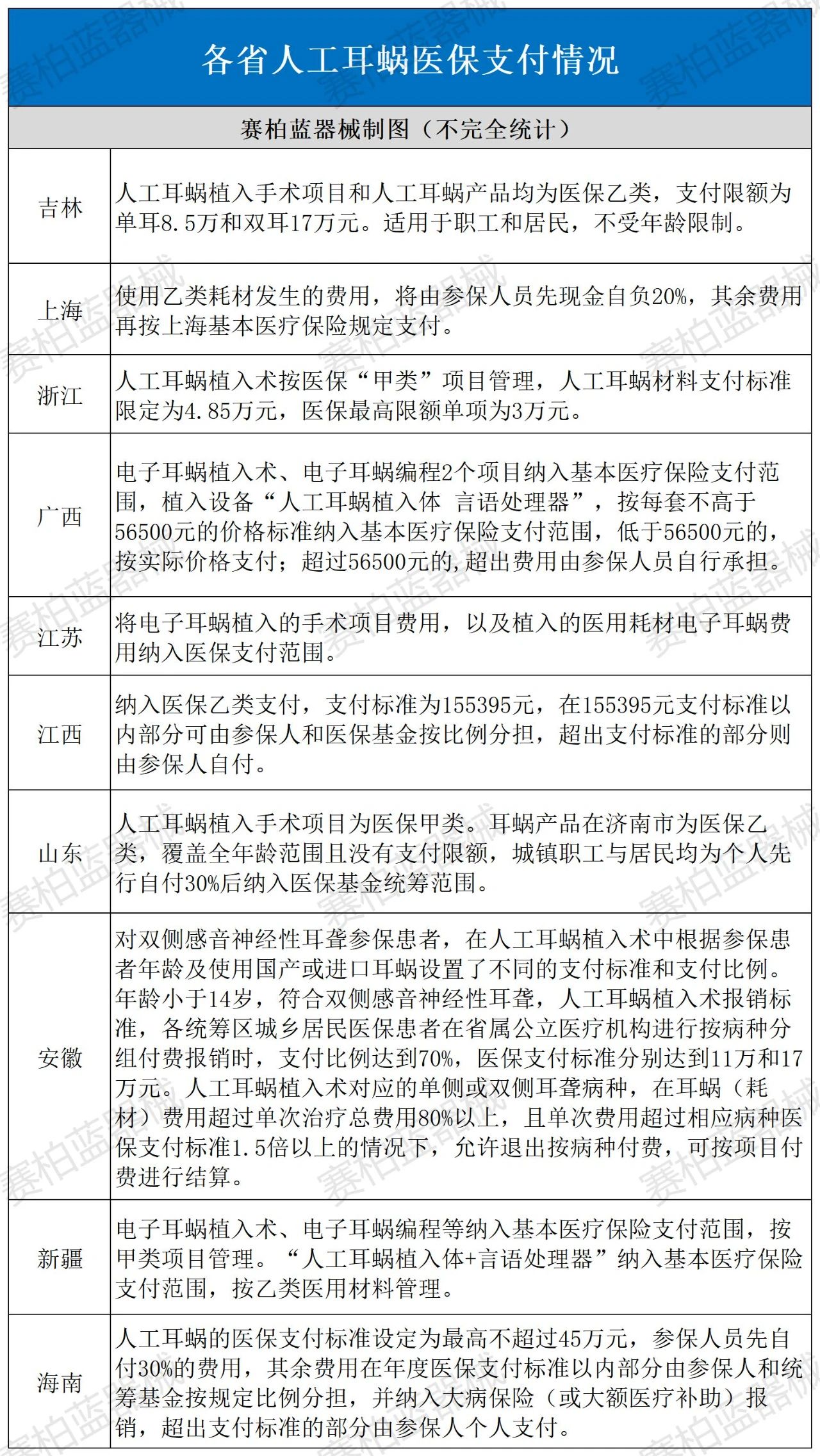 截至目前,吉林、上海、江蘇、浙江、安徽、福建、江西、山東、河南、廣東、廣西、新疆、海南等省份均已將人工耳蝸植入納入當地醫保報銷范圍,詳情如下: