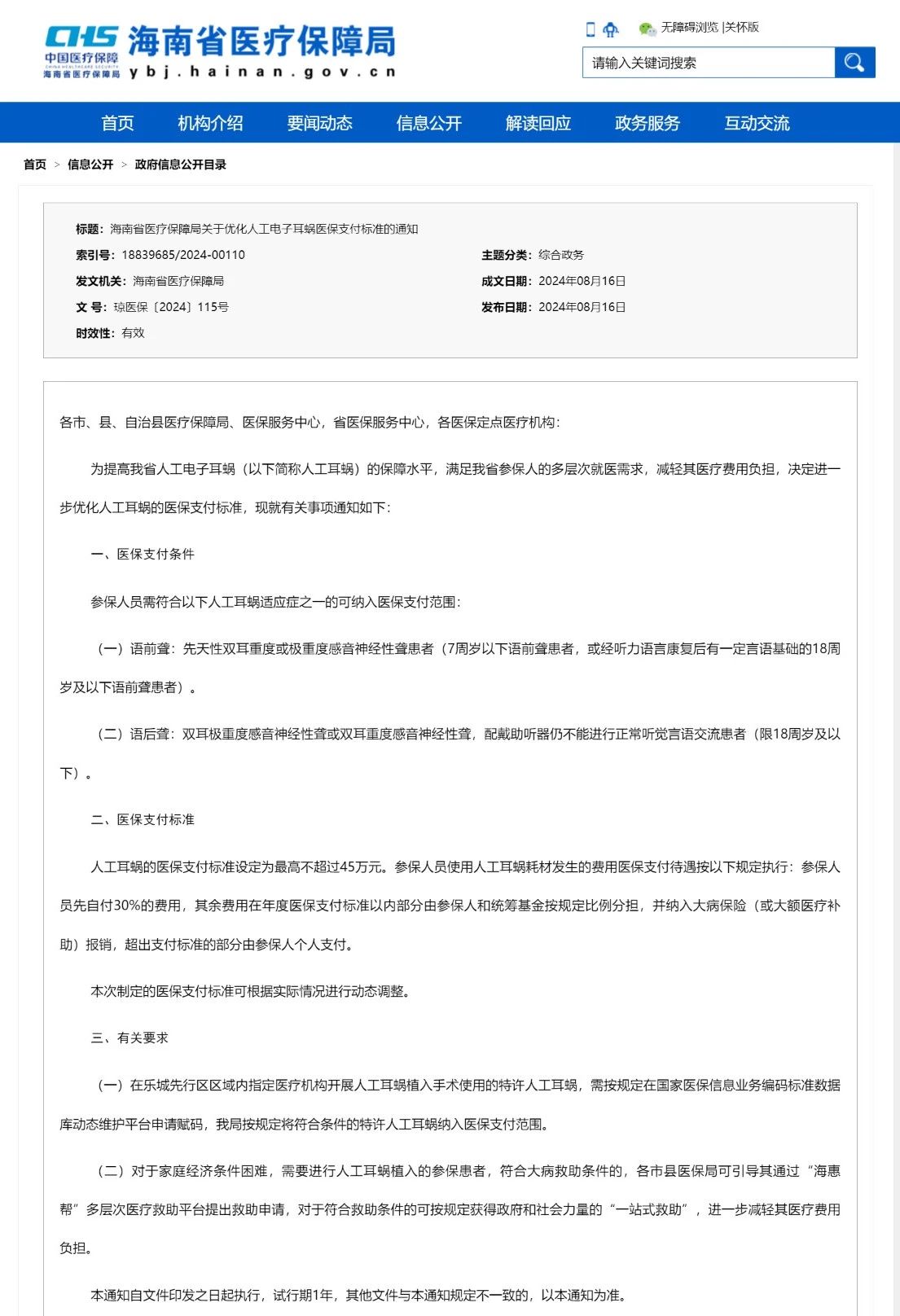 此外,在海南省樂城先行區區域內指定醫療機構開展人工耳蝸植入手術使用的特許人工耳蝸,需按規定在國家醫保信息業務編碼標準數據庫動態維護平臺申請賦碼,海南醫保局按規定將符合條件的特許人工耳蝸納入醫保支付范圍。
