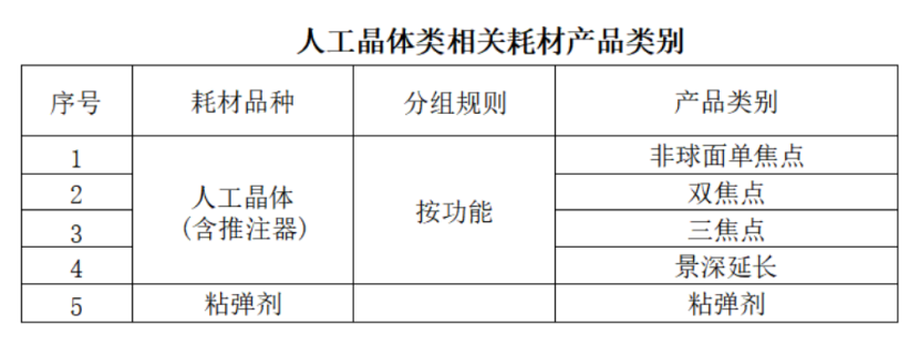 1.人工晶體類相關耗材: 獲得中華人民共和國醫療器械注冊證的人工晶體耗材(不包括硬性人工晶體、有晶體眼人工晶體,下同 )、粘彈劑。人工晶體耗材須包含可與其配套使用的推注器。