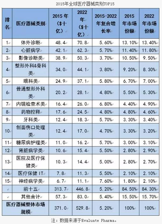 根據(jù)該報(bào)告,預(yù)計(jì)2015年至2022年年均增長(zhǎng)率保持在5.20%左右,全球醫(yī)療器械市場(chǎng)規(guī)模將超過5,200億美元,約為全球處方藥市場(chǎng)規(guī)模的50%左右。其中,前三類醫(yī)療器械類別是體外診斷、心臟病學(xué)和影像診斷,當(dāng)前全球市場(chǎng)規(guī)模均在350億美元以上。預(yù)計(jì)至2022年均在50億美元以上,最大的體外診斷類將超過700億美元。