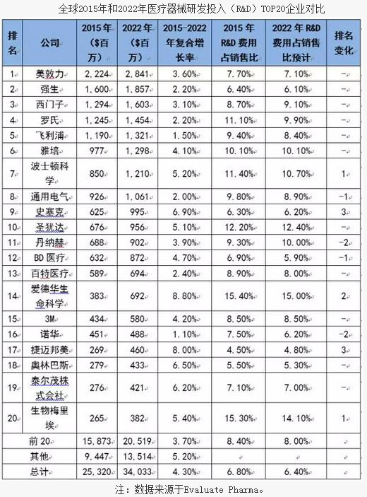 此外,根據(jù)全球醫(yī)療器械企業(yè)當(dāng)前的研發(fā)投入現(xiàn)狀及在研醫(yī)療器械產(chǎn)品梯隊(duì)建設(shè)現(xiàn)狀,至2022年預(yù)計(jì)有八家醫(yī)療器械企業(yè)的研發(fā)投入在10億美元以上。
