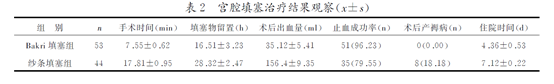 2.4觀察指標:① 再次出血率(給藥及術后24h出血率);② 宮腔填塞手術操作時間;③ 填塞物宮腔內留置時間;④ 止血顯效時間;⑤ 術后感染并發癥(每日測體溫4次,2次≥38C);⑥ 有無球囊、紗條脫落及取出后再出血等。