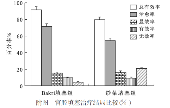 宮腔紗條填塞35例患者止血成功,術后24~38h內宮腔紗條取出順利。其中9例止血失敗患者中,1例B超提示疑為因胎盤植入行全子宮切除,1例行子宮動脈結扎,7例延長填塞時間、聯合子宮體或肌注欣母沛250μg、補充凝血因子后達到止血效果。術后2d 體溫超過38.5℃6例,其中38.0~39.3℃2例,繼續抗感染治療后體溫回復正常,3~5d后痊愈。可見,Bakri填塞術顯著優于紗條填塞組(P<0.05) ,見表2附圖。