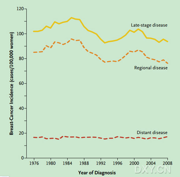 研究人員采用監測、流行病學和最終結果的數據分析了1976-2008年期間≥40歲女性中早期乳腺癌(導管原位癌和局部病變)及晚期乳腺癌(局灶及遠處病變)發生率的趨勢。