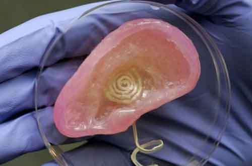 普林斯頓大學(xué)的一個納米科學(xué)家小組通過3D打印技術(shù)打印出了一只仿生耳朵,把電子元件和生物材料結(jié)合到一起,用靈活柔軟的3D打印耳朵來代替?zhèn)鹘y(tǒng)的機器假耳朵。