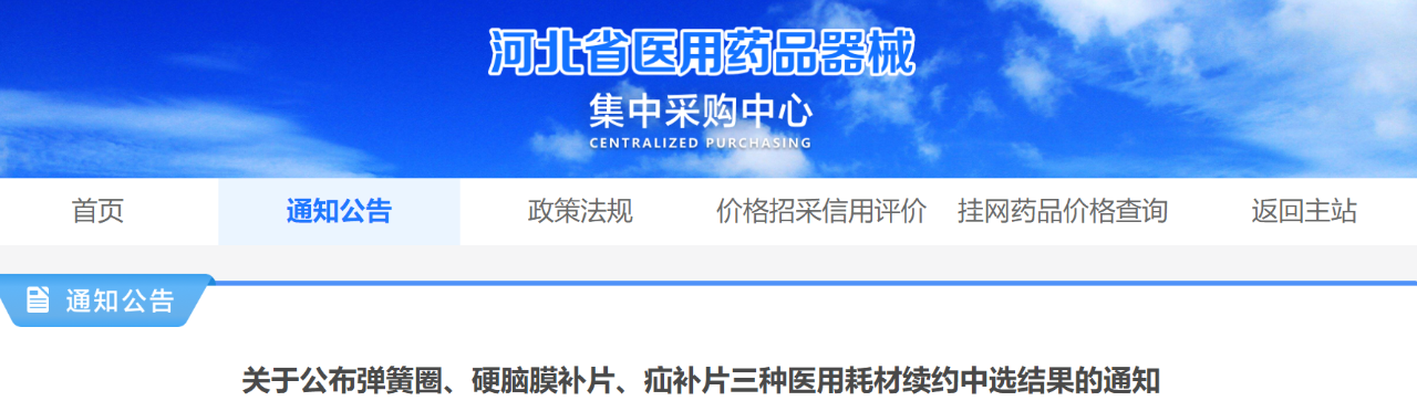 1月26日,河北省醫(yī)用藥品器械集中采購中心發(fā)布《關(guān)于公布彈簧圈、硬腦膜補(bǔ)片、疝補(bǔ)片三種醫(yī)用耗材續(xù)約中選結(jié)果的通知》。