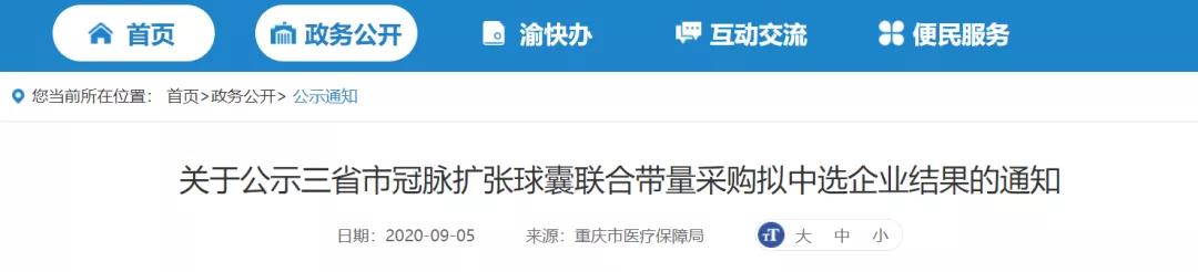 9月5日,重慶市醫保局發布《關于公示三省市冠脈擴張球囊聯合帶量采購擬中選企業結果的通知》。