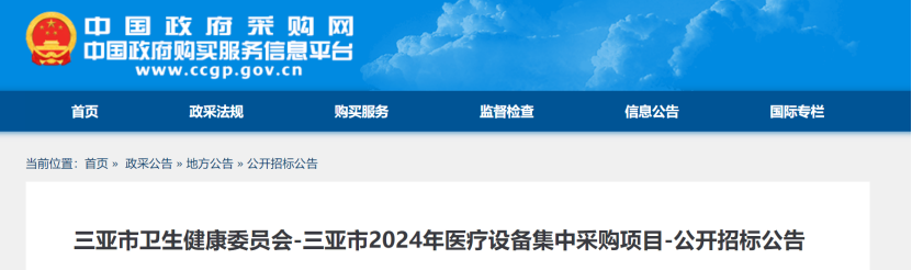 近日,中國政府采購網發布《三亞市衛生健康委員會-三亞市2024年醫療設備集中采購項目-公開招標公告》。