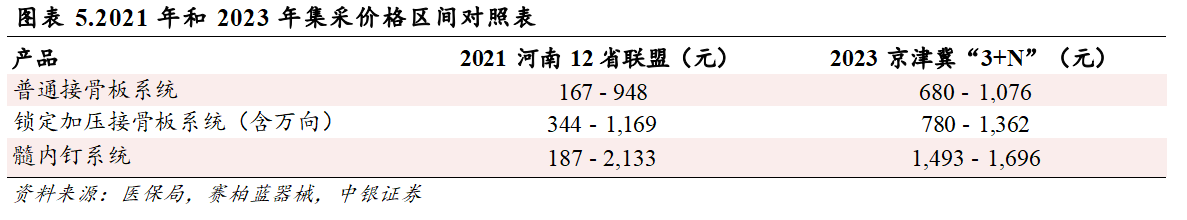 以骨科創傷類為例,2023年京津冀28省集采價格區間較2021年河南12省聯盟已有明顯提升,此次上海又在最高中選價再度上探。