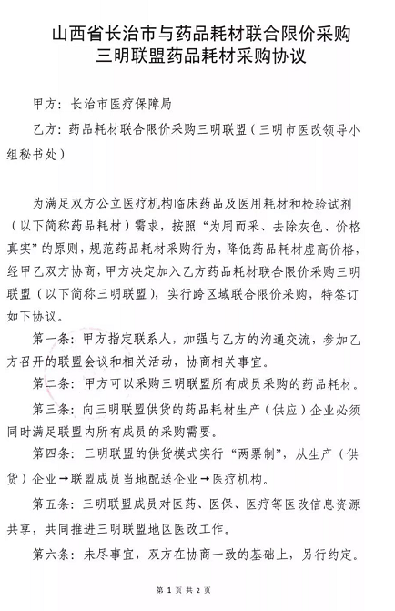 根據雙方的協議,本著滿足雙方公立醫療機構臨床藥品及醫用耗材和檢驗試劑(以下簡稱“藥品耗材”)需求,按照“為用而采、去除灰色、價格真實”的原則,規范藥品耗材采購行為,降低藥品耗材虛高價格,山西省長治市決定正式加入三明聯盟,實行跨區域聯合限價采購。