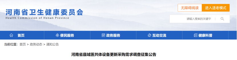 11月16日,河南衛(wèi)健委發(fā)布《河南省縣域醫(yī)共體設(shè)備更新采購需求調(diào)查征集公告》,向全國開展需求調(diào)查。本次采購意向預(yù)算5.83億元,采購設(shè)備包括CT、DR、彩超、全自動生化分析儀、救護(hù)車(包含車載設(shè)備)。
