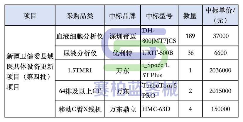 此次采購(gòu)血液細(xì)胞分析儀189臺(tái)、尿液分析儀36臺(tái)、1.5TMRI核磁共振成像儀1臺(tái)、電子計(jì)算機(jī)X射線斷層掃描儀(64排及以上)2臺(tái)、移動(dòng)C臂X線機(jī)4臺(tái),總預(yù)算金額3283.6萬(wàn)元。