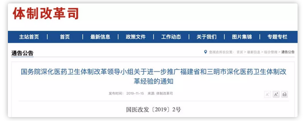 11月15日,國務(wù)院深化醫(yī)藥衛(wèi)生體制改革領(lǐng)導(dǎo)小組下發(fā)《關(guān)于進(jìn)一步推廣福建省和三明市深化醫(yī)藥衛(wèi)生體制改革經(jīng)驗的通知》(以下簡稱“通知”)釋放重大信號。