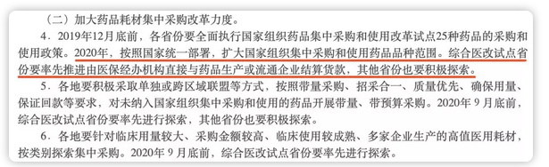 2020年,按照國家統(tǒng)一部署,擴大國家組織集中采購和使用藥品品種范圍。綜合醫(yī)改試點省份要率先推進(jìn)由醫(yī)保經(jīng)辦機構(gòu)直接與藥品生產(chǎn)或流通企業(yè)結(jié)算貨款,其他省份也要積極探索。