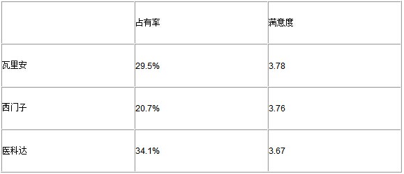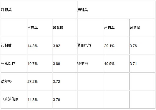 可以看出,德爾格在呼吸/麻醉類的市場占有率較高,但除此之外,在該領域的其他各家企業的市場占有率相差不大,呈群狼紛起狀。在呼吸類中,邁柯唯的滿意度最高,而在麻醉類滿意度最高的是通用電氣。