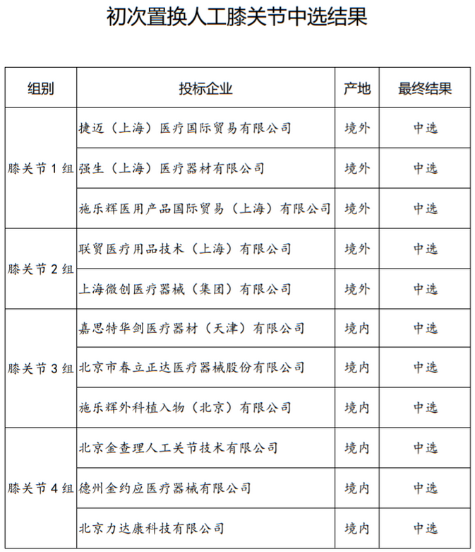 根據公告,初次置換人工膝關節中選企業包括強生、捷邁、施樂輝、上海微創等械企;