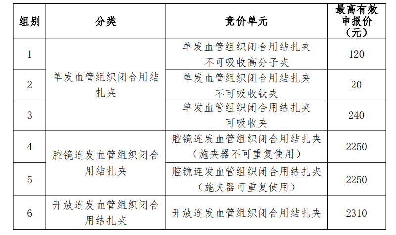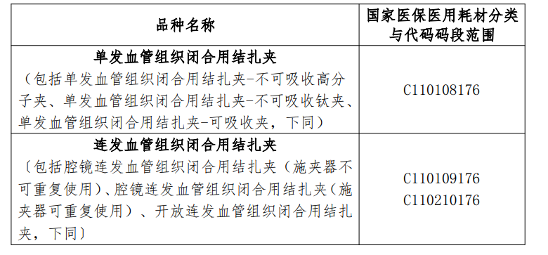 本次省際聯(lián)盟集中帶量采購(gòu)品種為以下類別獲得國(guó)內(nèi)有效注冊(cè)證的上市血管組織閉合用結(jié)扎夾類醫(yī)用耗材,包括但不限于下列國(guó)家醫(yī)保醫(yī)用耗材分類與代碼碼段范圍的產(chǎn)品。
