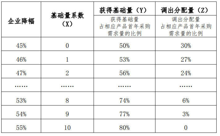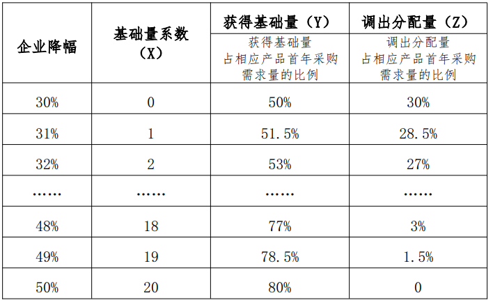 第一步:根據(jù)中選企業(yè)降幅不同,確定對(duì)應(yīng)的獲得基礎(chǔ)量和調(diào)出分配量。