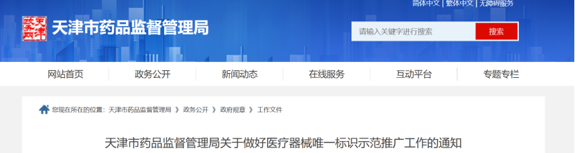 近日,天津市藥監局發布《天津市藥品監督管理局關于做好醫療器械唯一標識示范推廣工作的通知》(以下簡稱《通知》)。